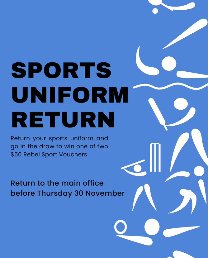 Return your sports uniform to the main office before Thursday 30 November and go in the draw to win one of two $50 Rebel Sports Vouchers.