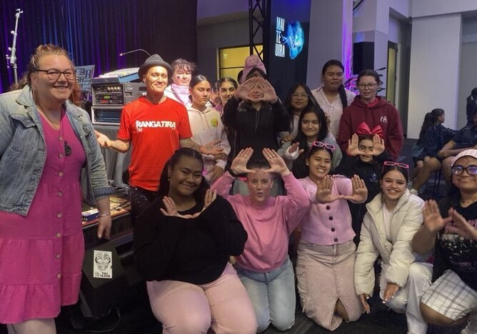 Last Friday the Studio Hub were lucky enough to go to Toitoi and experience Mai Te Uira - a music experience where acclaimed musician Tiki Taane created music tracks right there, in the moment, with digital representations by artist Kereama Taepa. Our students had a ball and were stoked to get a photo with Tiki himself. @tikitaane