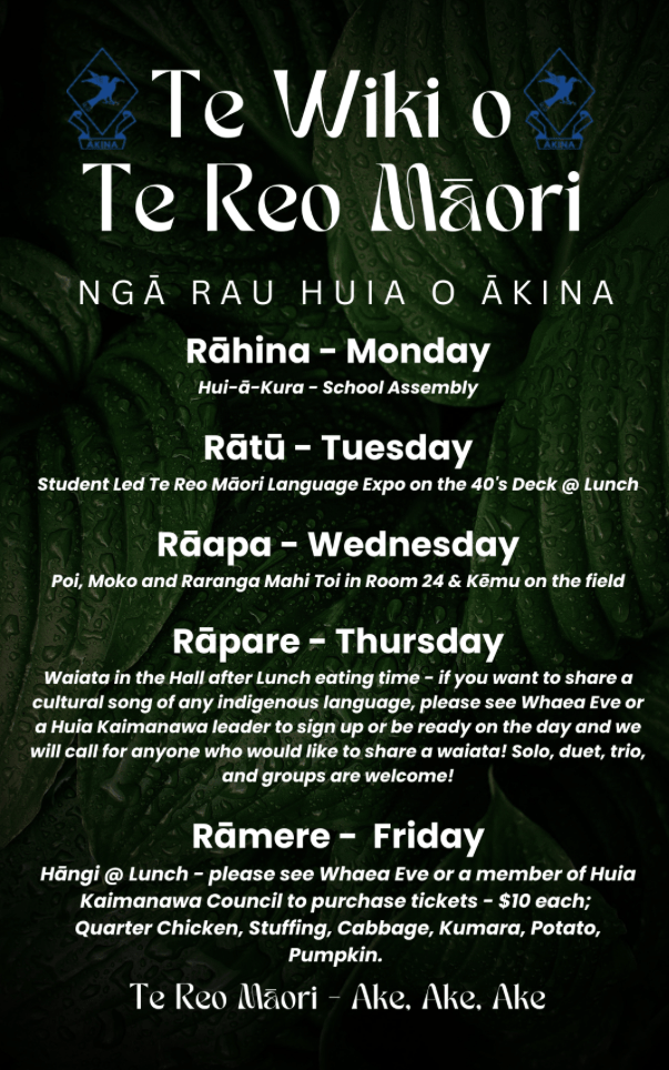 We’ve got an exciting lineup of activities planned for the week, designed to engage students, staff, and whānau in meaningful ways. From learning new phrases and songs to interactive workshops, there will be plenty of opportunities for everyone to get involved. Don’t miss out—check the attached list of events and join us as we celebrate Te Wiki o te Reo Māori! Kia kaha te reo Māori!