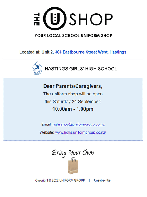 The Uniform Shop is open every Monday, Tuesday and Thursday, 3pm - 5pm.