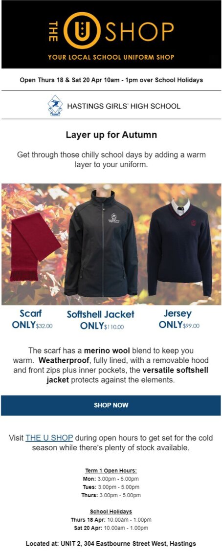 Please note: The UShop is open on Thursday 18 April & Saturday 20 April, 10am-1pm.