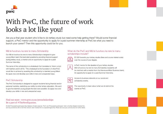 Are you a final Year 13 student who'd like to do tertiary study but need some help getting there? Would some financial support, a PwC mentor and the opportunity to apply for a paid summer internship at PwC be what you need to launch your career? Then this opportunity could be for you.