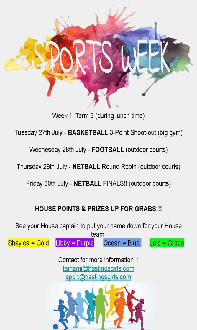 Just a friendly reminder that we have Sports Week on the first week back from school holidays during lunch time. House points and prizes up for grabs! There will be prizes for competitors and spectators.