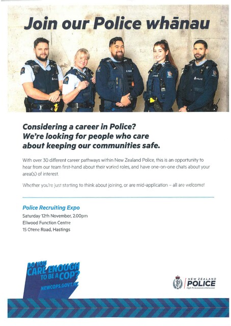 Ngā Pirihimana o Aotearoa-NZ Police are running a recruitment event on 12 November at 2pm. Please see the details in the flyer. It will be a great event to hear from the experts on how you can become a member of Ngā Pirihimana o Aotearoa-NZ Police. There are over 30 careers you can have as a member of Ngā Pirihimana o Aotearoa.